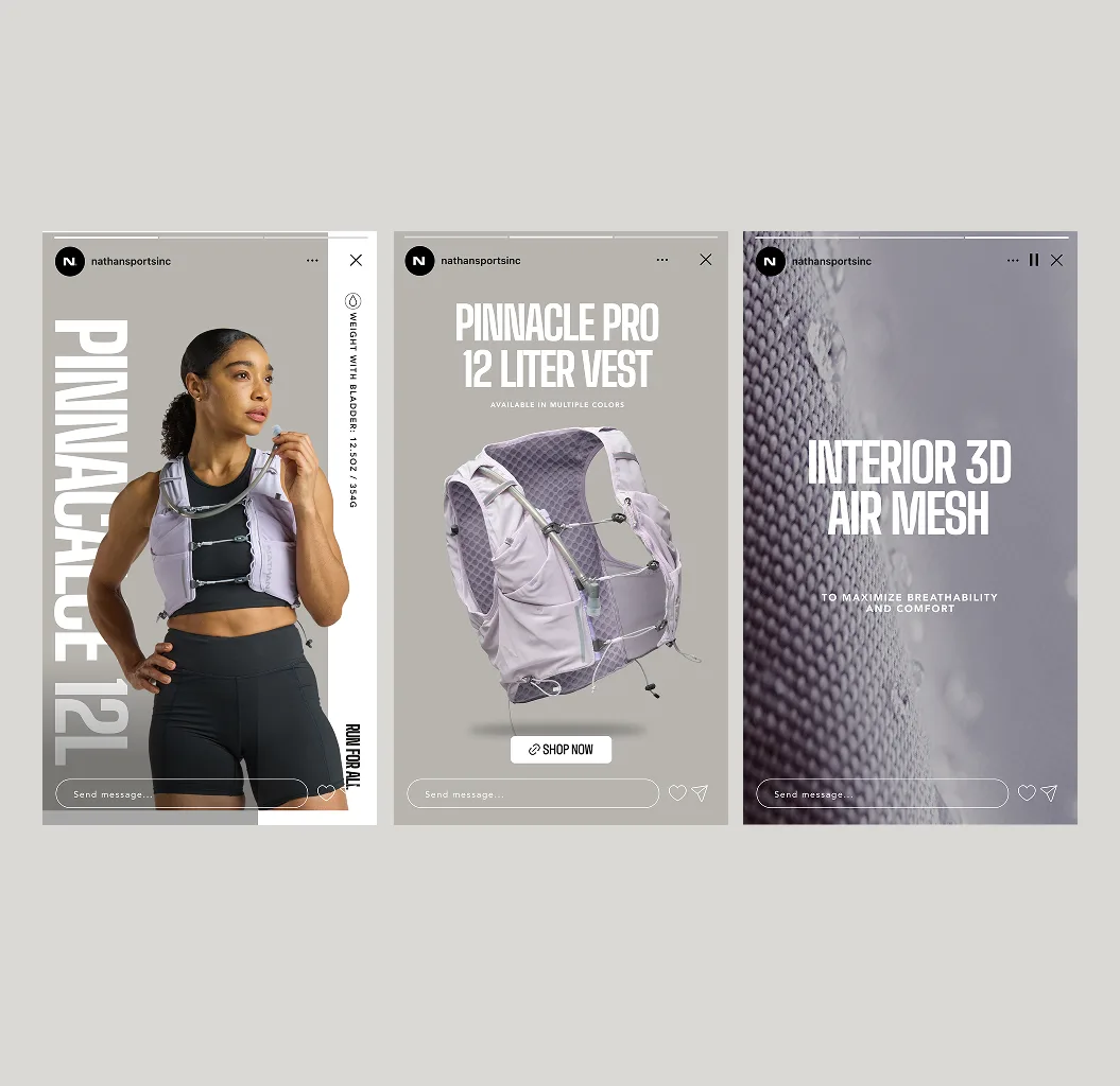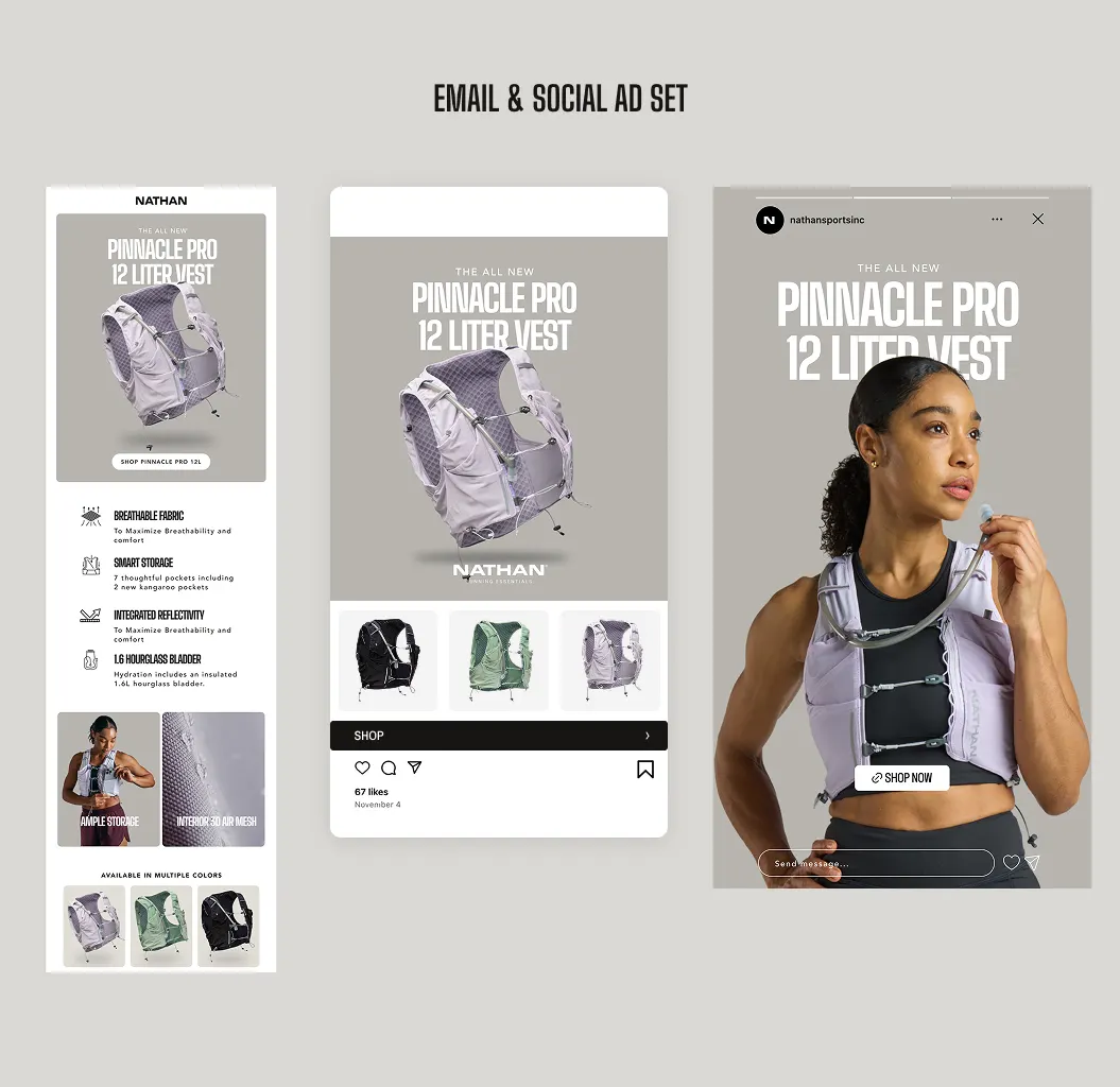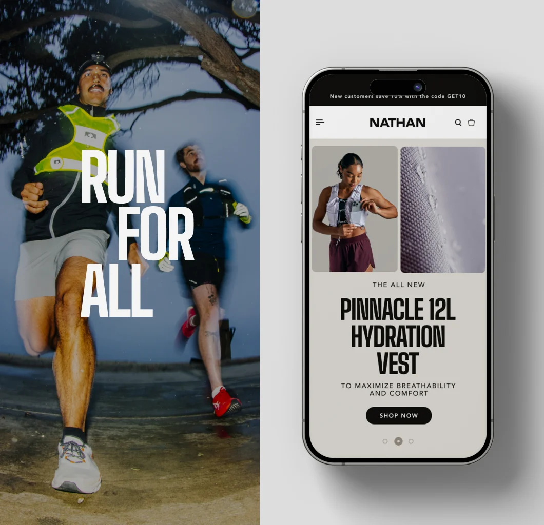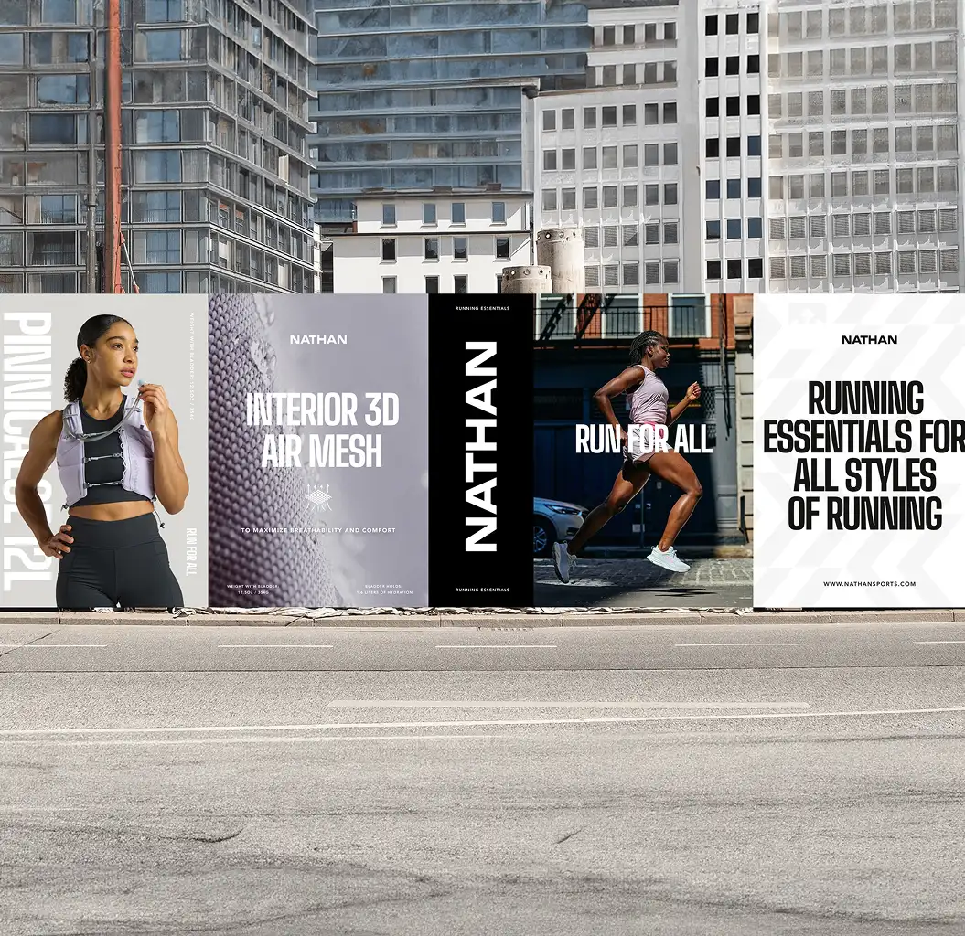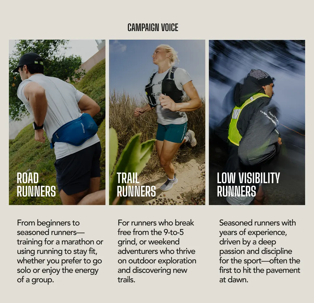 The goal of this project was to refocus Nathan on what it does best: hydration and running essentials. Post-COVID, the brand had drifted toward apparel and lost touch with everyday runners. The refresh introduced a new creative direction anchored by Run For All, now the brand’s core slogan, bringing a more relatable, realistic approach to running while reconnecting Nathan to its performance roots.